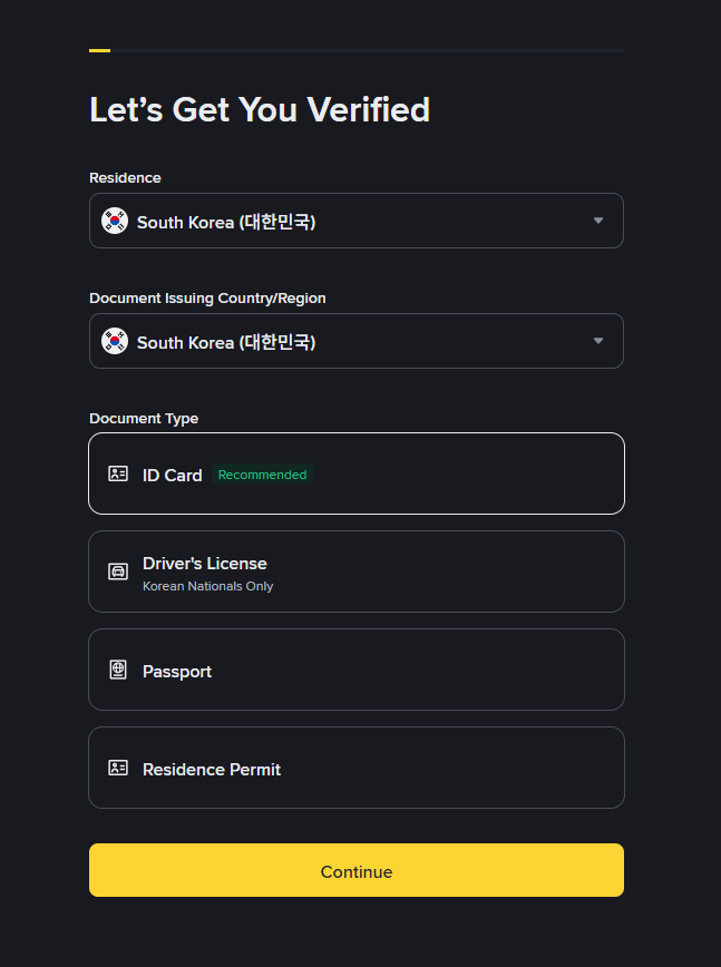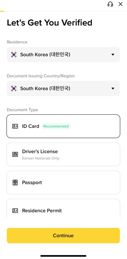 국적과 거주국가를 선택하시고 인증 받을 신분증 유형 1개를 선택하세요