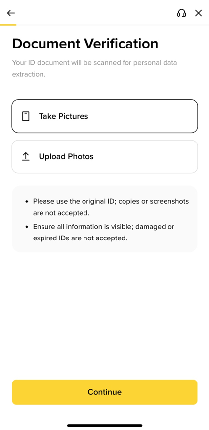 Take Pictures 를 눌러 신분증을 카메라로 인증하거나,