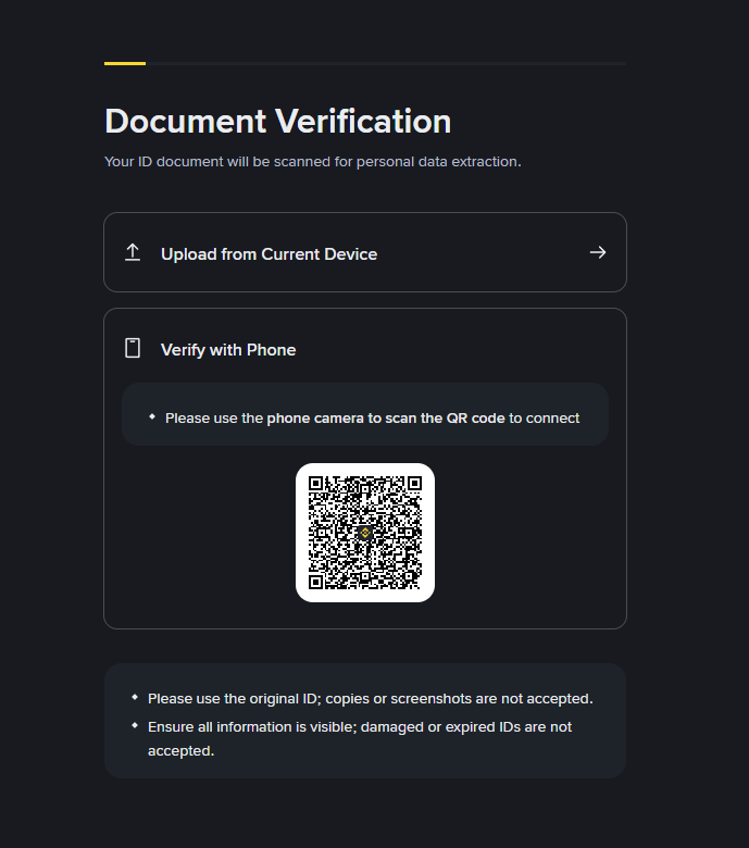 ‘Upload from Current Device’ 를 클릭하시면 신분증 파일을 업로드할 수 있습니다