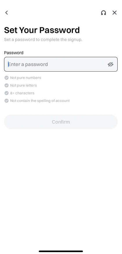 마지막으로 비밀번호를 설정하신 다음 Confirm 을 누르시면 가입이 완료됩니다