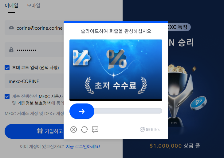 이메일로 날아온 6자리 인증코드를 MEXC 홈페이지에 입력하시면 가입이 완료됩니다