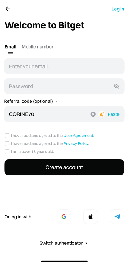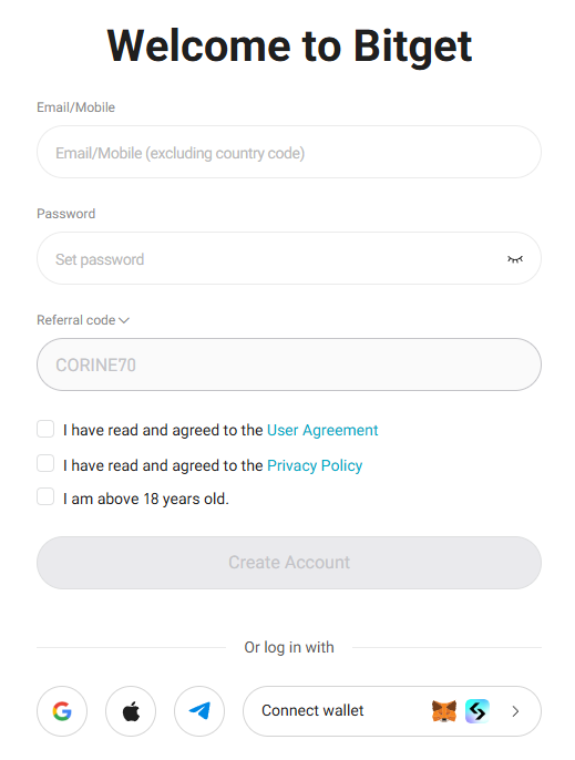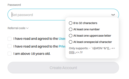 Referral code (optional) 을 클릭하여 레퍼럴 코드 입력란을 열어주세요