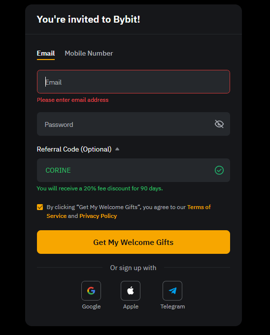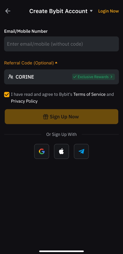 Referral Code (optional) 을 클릭하여 레퍼럴 코드 입력란을 열어주세요