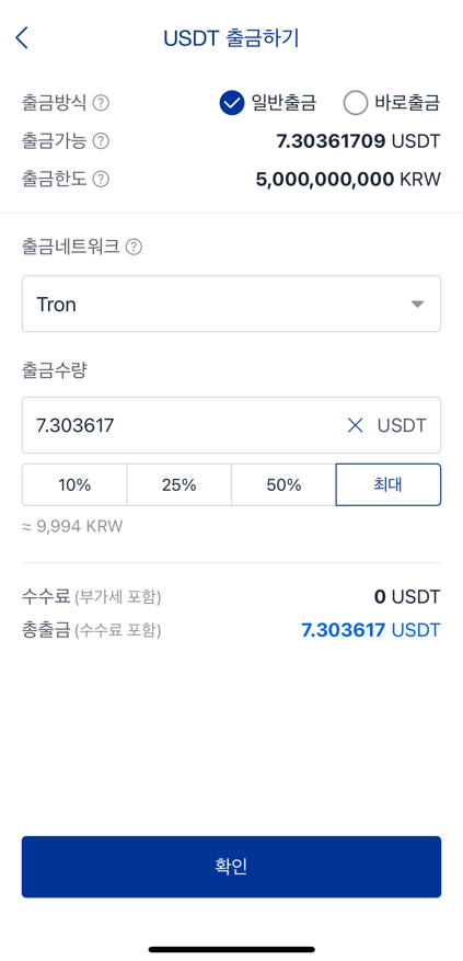 출금 거래소에서 코인(USDT), 네트워크(Tron), 출금수량을 설정하시고 확인을 눌러주세요