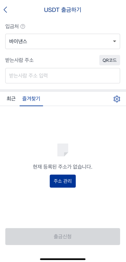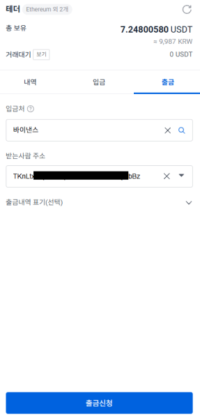 입금처 바이낸스 거래소를 선택하시고 바이낸스 테더주소를 입력하시고 출금신청 버튼을 누르시면 바이낸스에 테더가 입금됩니다
