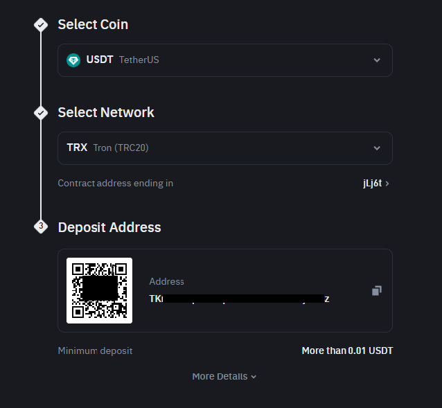 입금처를 바이낸스로 선택하시고 바이낸스 테더코인(USDT) 트론네트워크(Tron) 주소를 넣은 다음 출금신청을 하시면 바이낸스 입금이 완료됩니다