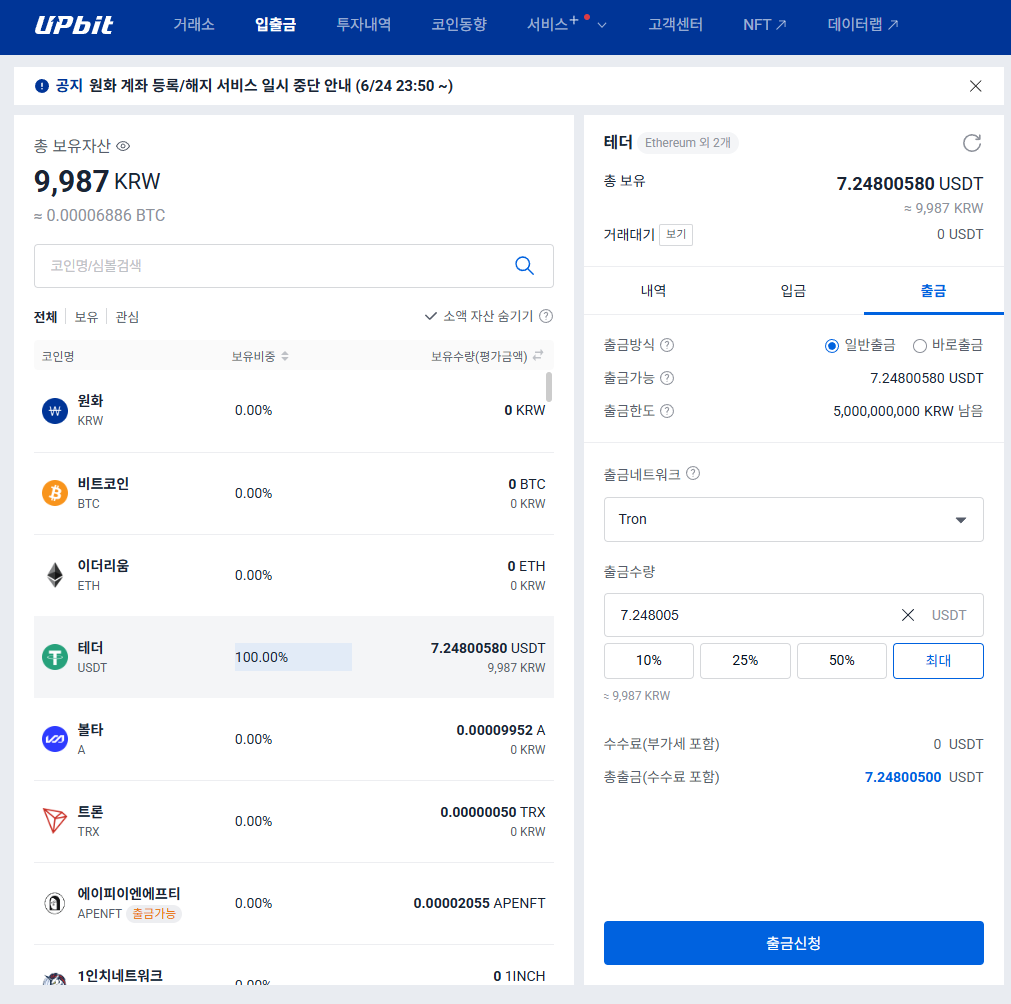 출금 거래소에서 출금할 코인(테더,USDT)을 선택하시고 네트워크(Tron)를 선택한 다음